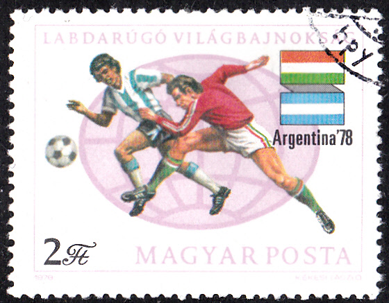 In Ungarn erschien zur WM 1978 eine Serie von Marken, die den ersten Gruppenspielen der WM 1978 gewidmet sind. Hier die Marke (MiNr 3284 A) zum Eröffnungsspiel in der Gruppe 2 Deutschland - Argentinien am 1. Juni 1978 in Buenos Aires, das 0:0 endete.