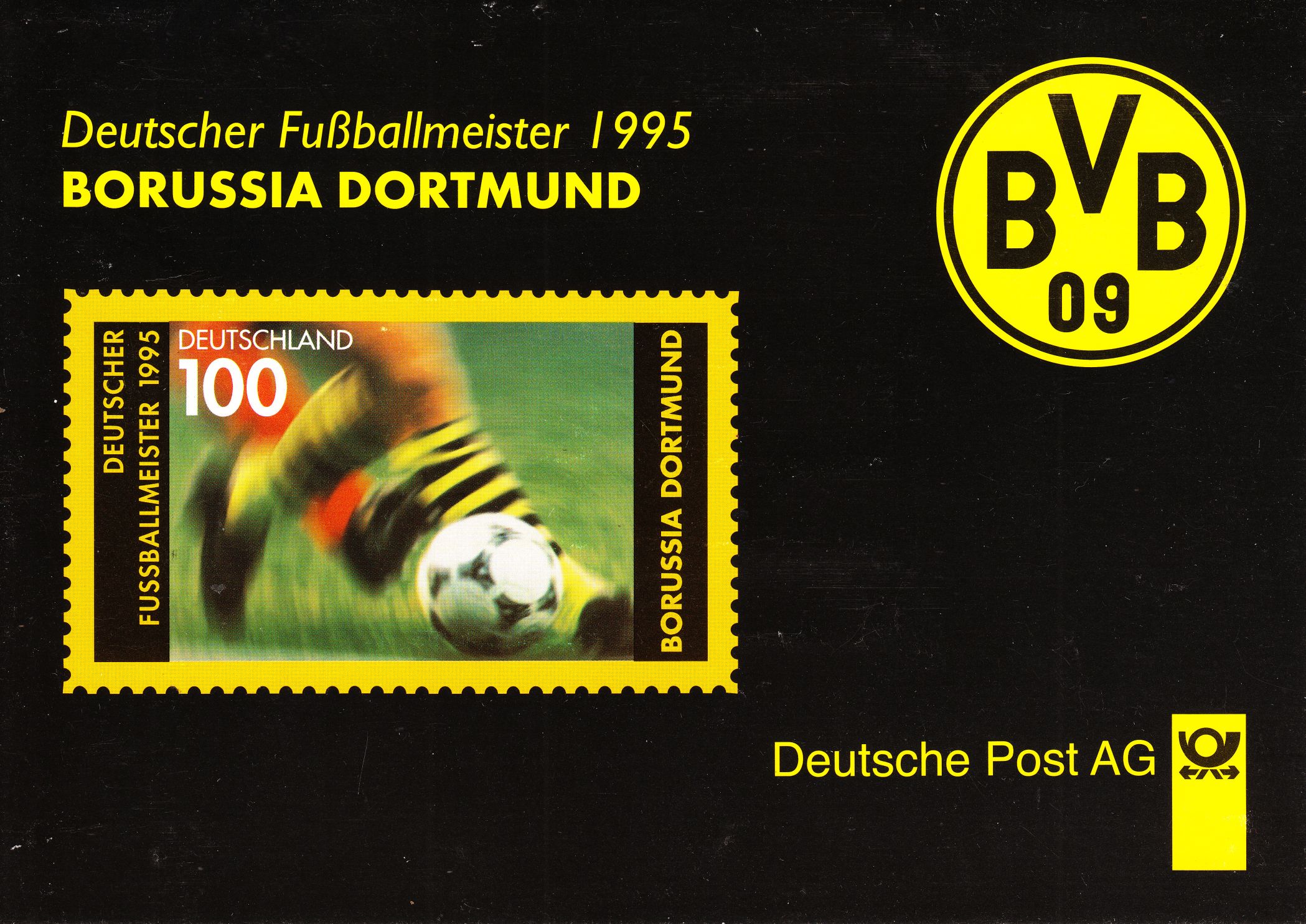 In der Saison 1994/95 wurde Borussia Dortmund deutscher Fußballmeister. Die Deutsche Bundespost gab dazu am 6.12.1995 eine Sondermarke heraus. Hier ein Brief mit dieser Marke und dem Ersttagsonderstempel Berlin.