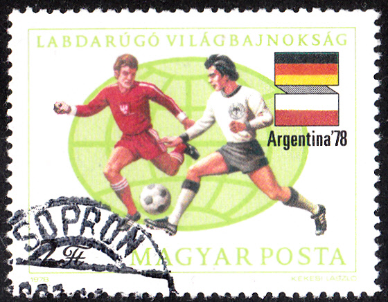 In Ungarn erschien zur WM 1978 eine Serie von Marken, die den ersten Gruppenspielen der WM 1978 gewidmet sind. Hier die Marke (MiNr 3284 A) zum Eröffnungsspiel in der Gruppe 2 Deutschland - Argentinien am 1. Juni 1978 in Buenos Aires, das 0:0 endete.
