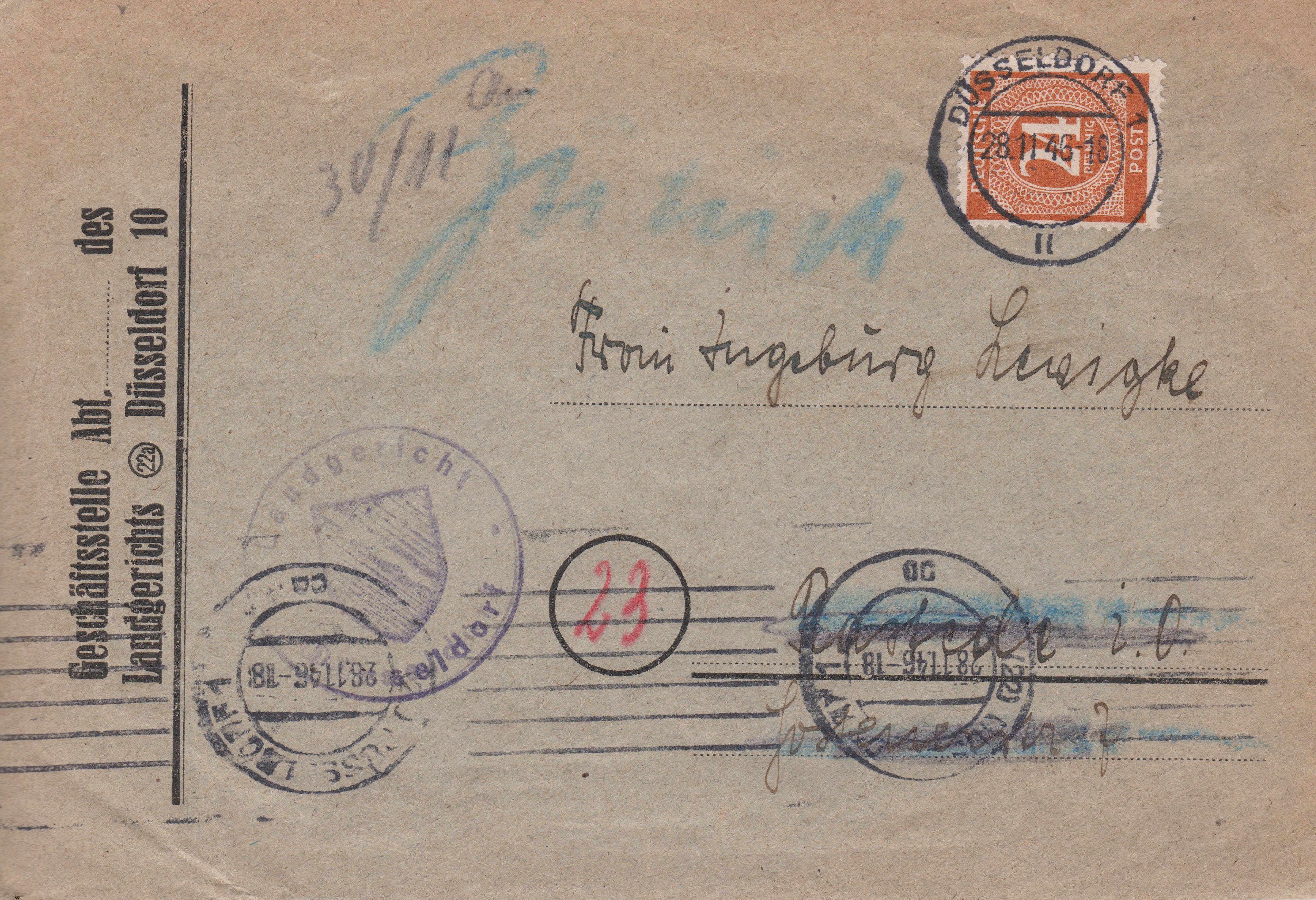 Einzelfrankatur MiNr. 925 am 07.08.1946 auf Brief vom Landgericht Düsseldorf, portogerecht im Fernverkehr von (22) DÜSSELDORF nach 10 Grosskötner über Hettstedt: