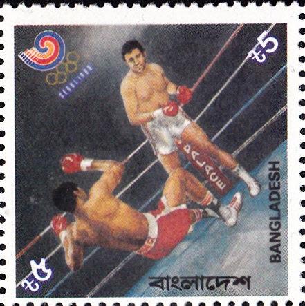 Zu den Olympischen Spielen 1988 in Seoul ist diese Marke aus Bangladesch (MiNr 281) erschienen. Im Markenbild sind zwei Boxer zu sehen, wobei der linke Boxer offenbar gerade nach einem Treffer zu Boden geht.