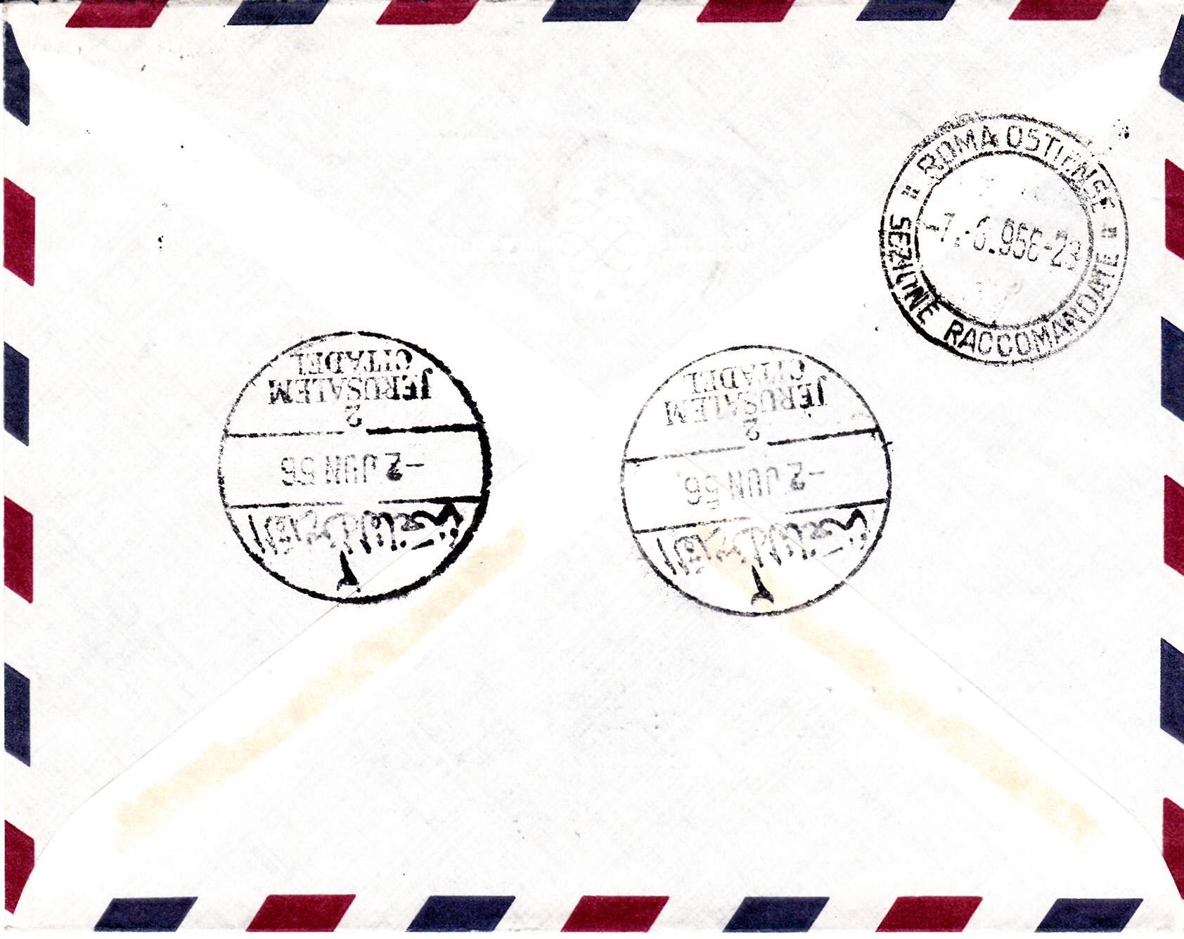 Rückseitig wurde der Brief auch bei der Aufgabe am 2.6.1956 in Jerusalem zweimal gestempelt und bei der Ankunft am 7.6.1956 in Rom.