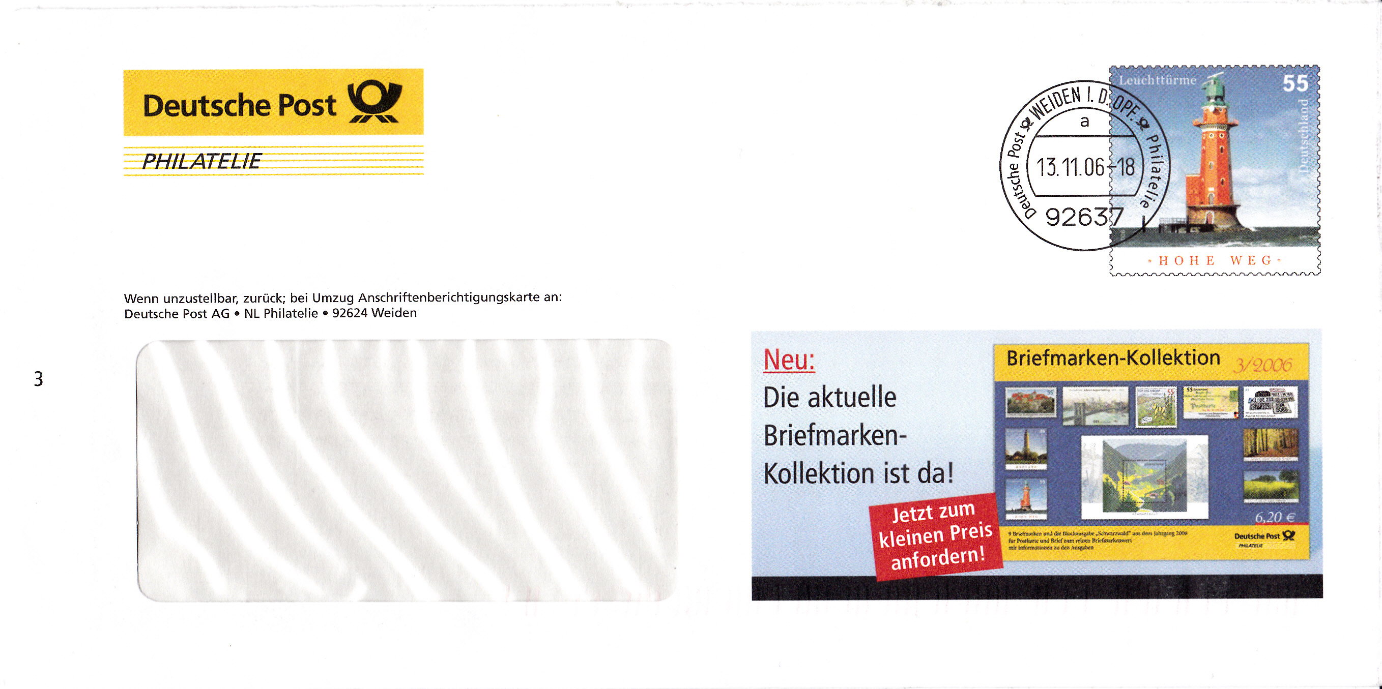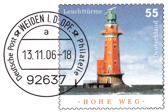 Dieser Ganzsachenumschlag (MiNr EA F172) im Format 229x114 mm hat einen Wertstempel mit der 55 Cent-Marke "Leuchtturm Hohe Weg" (MiNr 2556). Die Vorausentwertung trägt das Datum 13.11.06". Die Rückseite ist nicht bedruckt.