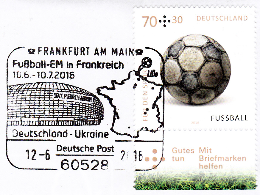 Am 16.6.2016 spielte die deutsche Mannschaft in Saint-Denis gegen Polen. Das Spiel endete 0:0. In Frankfurt am Main gab es zu diesem Spiel einen Sonderstempel. Im Stempelbild wird das Stadion in Saint-Denis und ein Länderumriss Frankreichs mit einem Fußballspieler gezeigt.