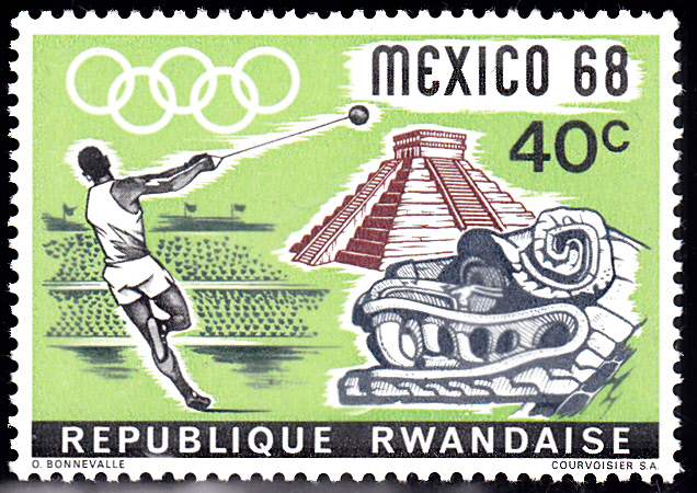 Diese Marke aus Ruanda (MiNr 262 A) zu den Sommerspielen 1968 zeigt einen Hammerwerfer.