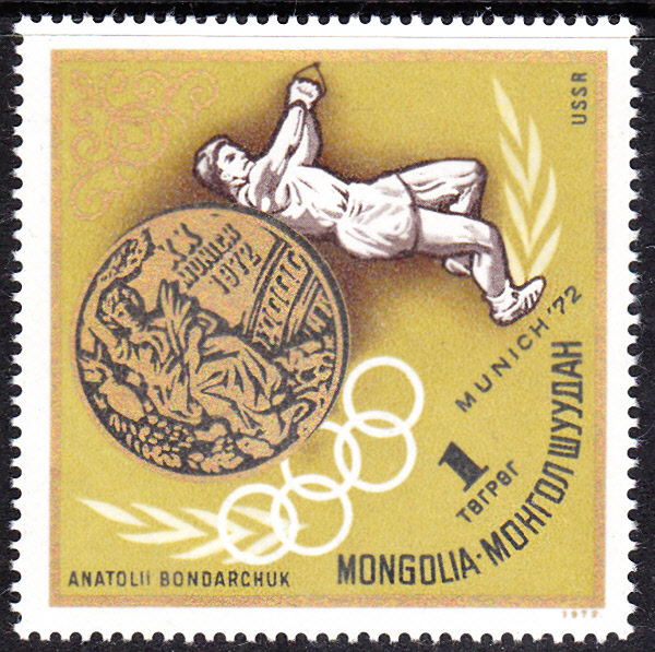 Auch in der Mongolei erscheint Anatolij Bondartschuk, Olympiasieger 1972 im Hammerwurf, wird auf einer Marke (MiNr 754).