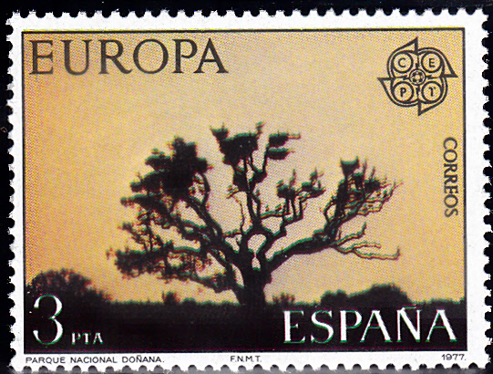 Die Europamarken 1977 zum Gemeinschaftsthema "Landschaften" erschienen in Spanien am 2. Mai 1977. Hier die Marke zu 3 Peseta mit einem Bild aus dem Doñana-Nationalpark. Die Auflage betrug 8 000 000 Stück.