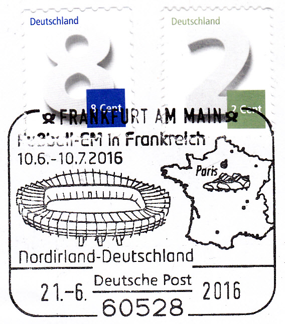 Am 21.6.2016 spielte die deutsche Mannschaft in Paris gegen Nordirland. Die deutsche Mannschaft gewann mit 1:0. In Frankfurt am Main gab es zu diesem Spiel einen Sonderstempel. Im Stempelbild wird das Stadion in Paris und ein Länderumriss Frankreichs mit Fußballschuhen gezeigt.