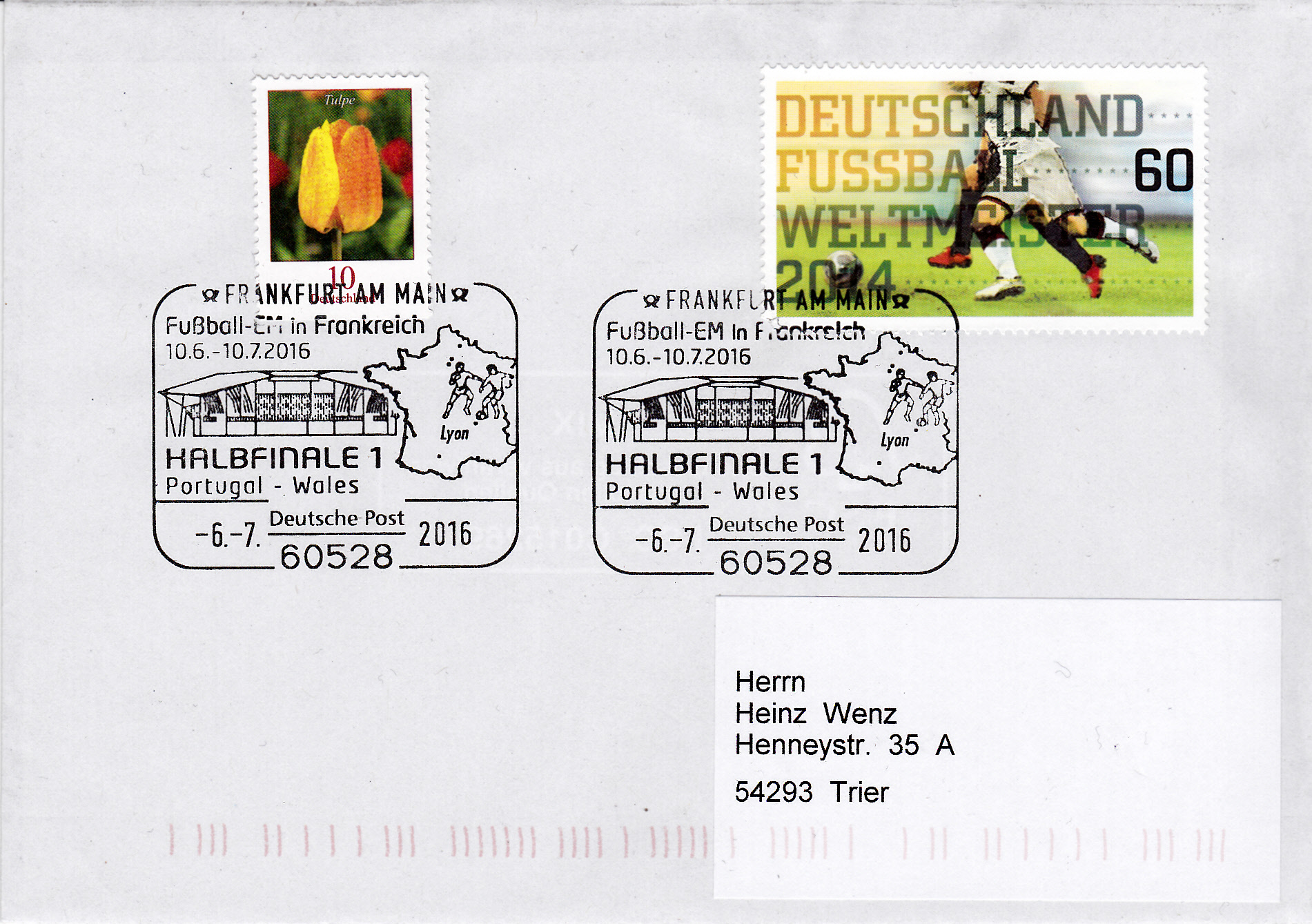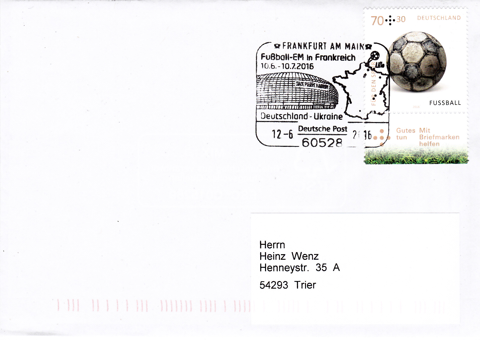 Am 16.6.2016 spielte die deutsche Mannschaft in Saint-Denis gegen Polen. Das Spiel endete 0:0. In Frankfurt am Main gab es zu diesem Spiel einen Sonderstempel. Im Stempelbild wird das Stadion in Saint-Denis und ein Länderumriss Frankreichs mit einem Fußballspieler gezeigt.