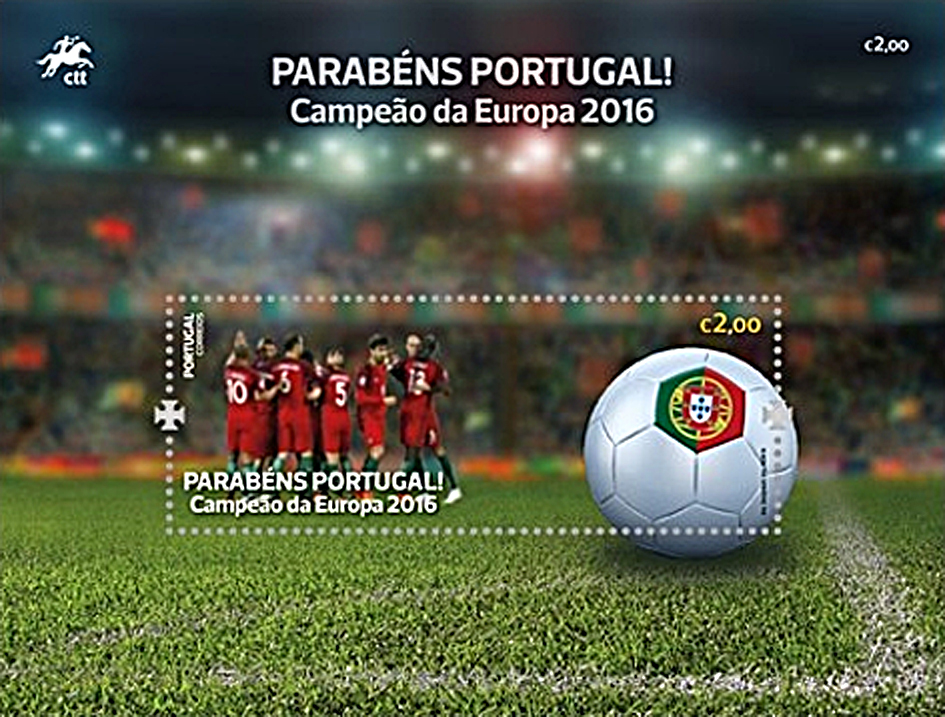 “Glückwunsch, Portugal!” heißt es auf dem am 11. Juli erschienenen Gedenkblock anläßlich des in Paris im Finale gegen Frankreich gewonnenen Europameistertitels. 50.000 Auflage, Nennwert 2 Euro, gedruckt am letzten Wochenende. So u.a. entnimmt man es der Netz-Mitteilung von Portugals Post: “Esta foi uma produção filatélica produzida em tempo recorde, desde o final da semana passada e impressa nas oficinas da Imprensa Nacional Casa da Moeda. O design foi da responsabilidade do serviço de Filatelia dos CTT. A emissão tem uma tiragem de 50 mil exemplares.”