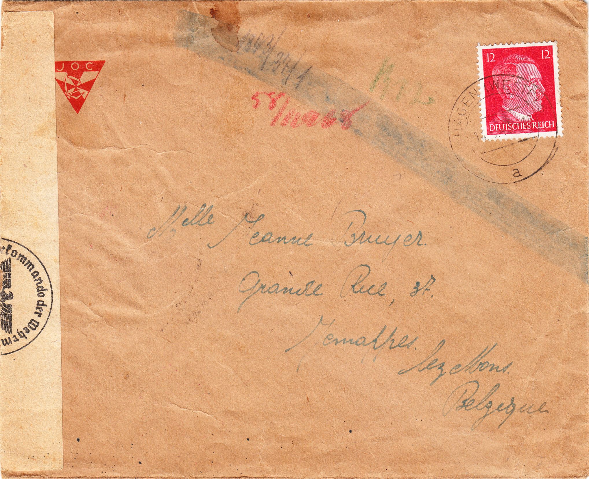 Dieser nach Belgien adressierte Brief wurde, mit 12 Pfennig zum Inlandtarif frankiert, am 14.05.1943 in Hagen in Westfalen aufgegeben: