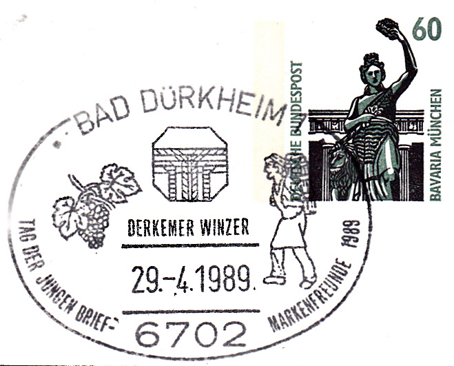 Diese Privatganzsache mit Sonderstempel vom 29.4.1989 aus Bad Dürkheim zum Tag der Jungen Briefmarkenfreunde 1989 passt gut in eine Sammlung "Wein". Im Zudruck der Ganzsache und im Stempelbild wird jeweils ein "Derkemer (= Bad Dürkheimer) Winzer gezeigt, im Stempel auch noch Weintrauben.-