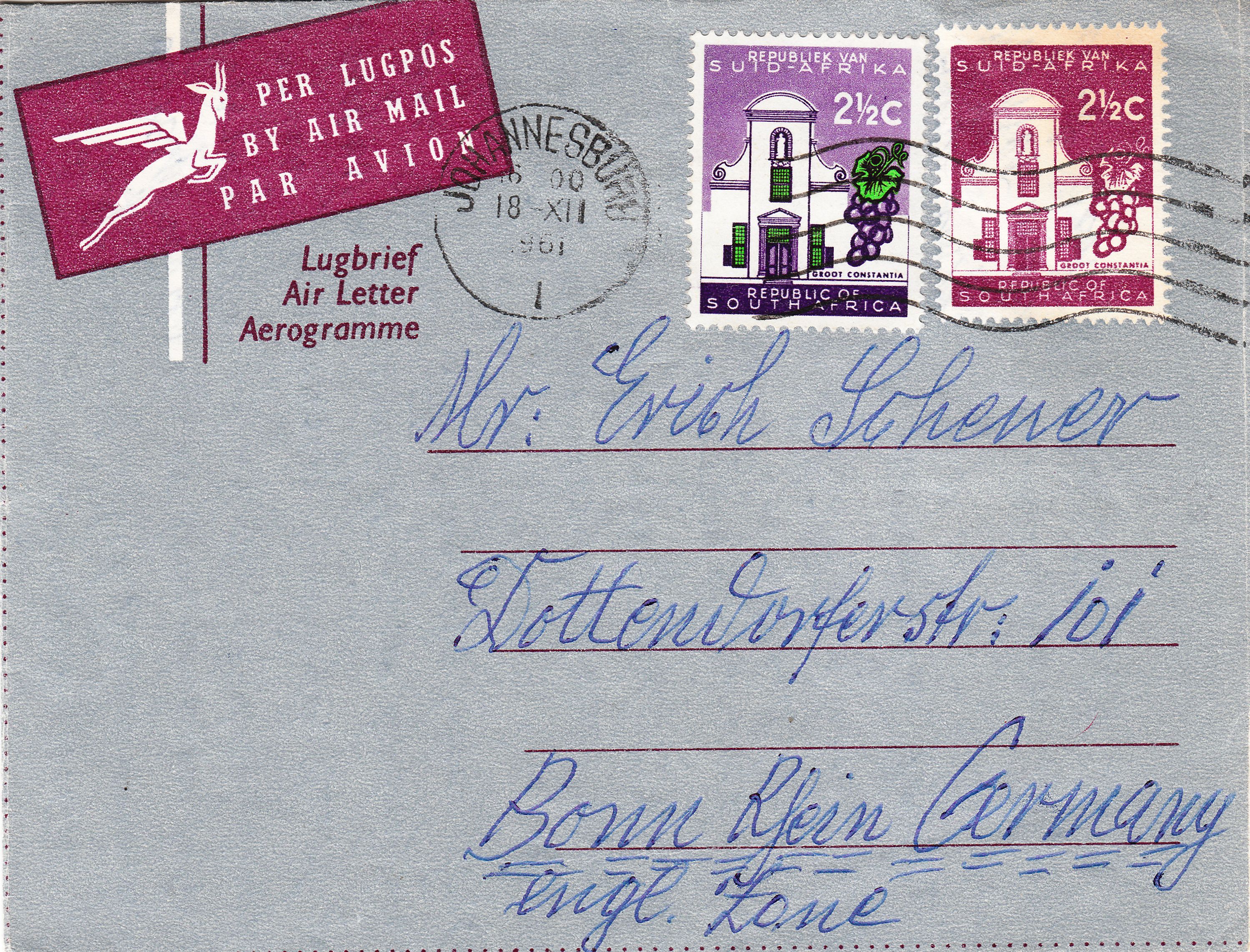 Hier ein Aerogramm mit eingedrucktem Postwertzeichen und motivgleicher Zusatzfrankatur: