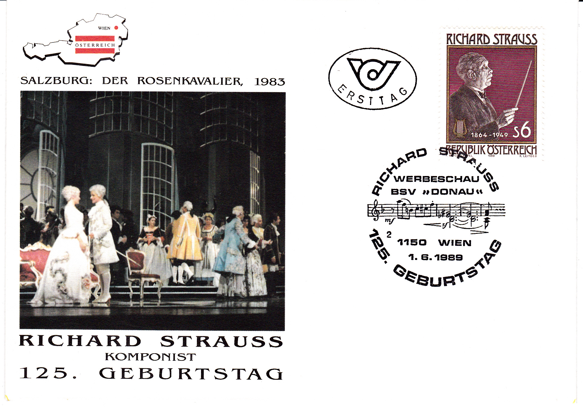 Die bereits gezeigte Sondermarke zum 125.Geburtstag von Richard Strauss aus Österreich wurde hier auf einem leider nicht gelaufenem Ersttagsbrief mit einem passenden Sonderstempel aus Wien (Kennziffer 2) abgestempelt.