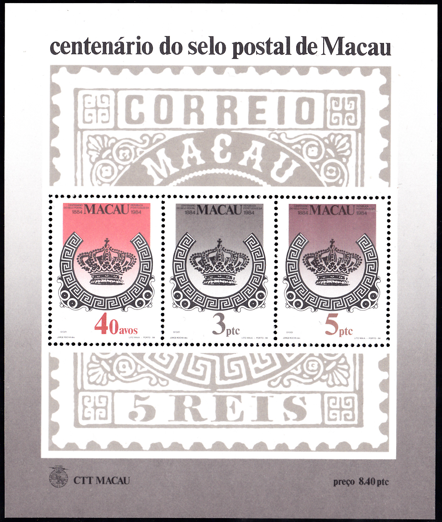 Aus dem Jahre 1984 stammt auch dieser Satz zum Ereignis "100 Jahre Briefmarken von Macau". Die drei bildgleichen Marken zeigen die Krone von den ersten Marken aus Macau.