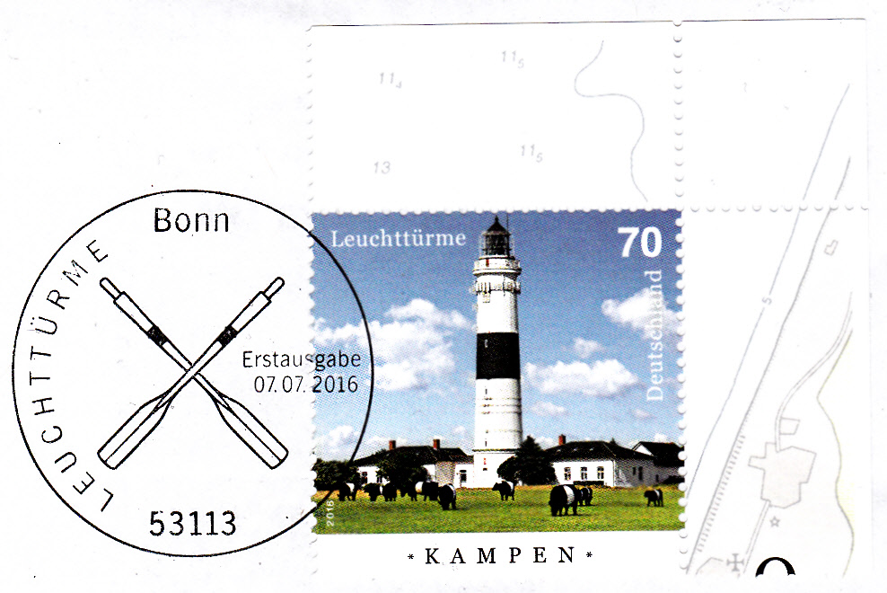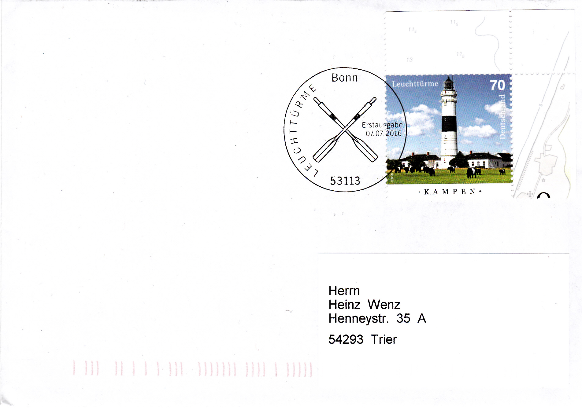 Die Marke in der Leuchtturmserie mit der Abbildung des Leuchtturms Kampen (MiNr 3253) wurde hier auf einem Brief am Ersttag mit dem Ersttagsonderstempel Bonn entwertet.