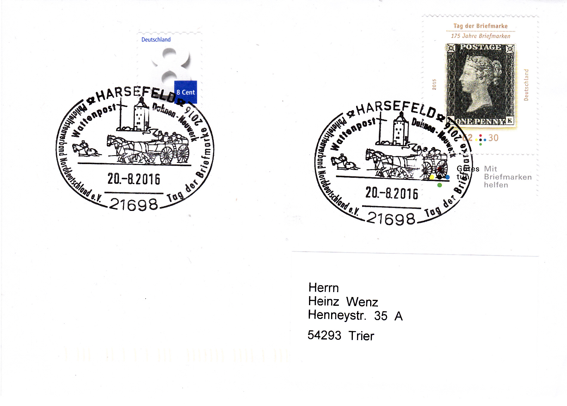 In diesem Sonderstempel aus Harsefeld vom 20.8.2016 zum Tag der Briefmarke 2016 wird auch im oberen Teil des Stempels der hier bereits in einem Beitrag erwähnte Leuchtturm Neuwerk gezeigt.
