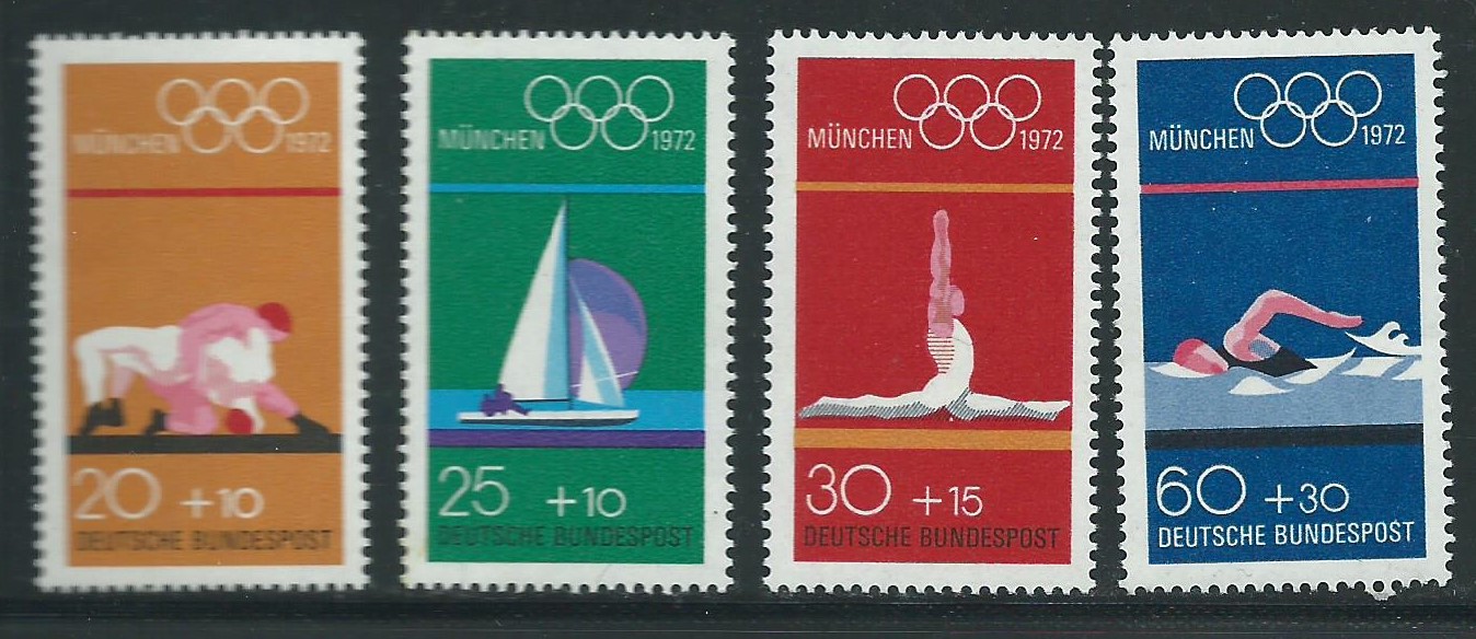 Neben den ganzen Blockausgaben kam noch ein Satz Einzelmarken mit Zuschlag an die Postschalter: Mi.Nr. 719 bis 722. Hier sind die Sportarten Ringen, Segeln, Bodenturnen und Schwimmen abgebildet.