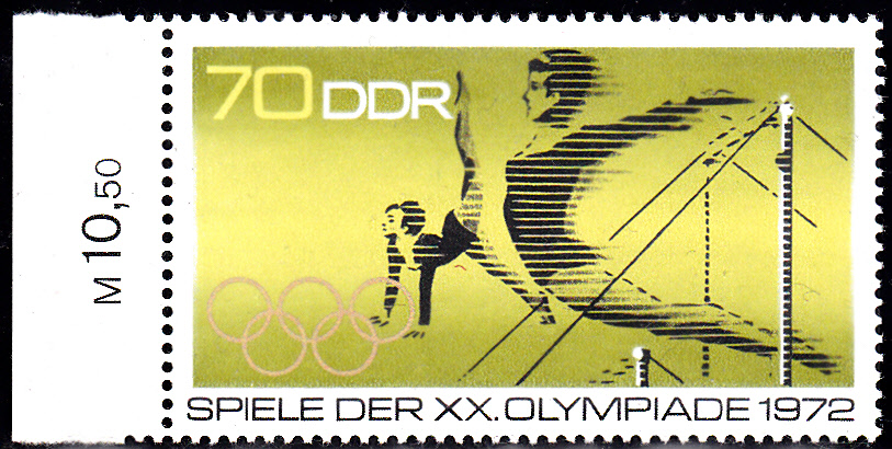 Auf der Marke zu 20Pf (MiNr 1755) wird ein Stabhochspringer beim Überqueren der Latte gezeigt.