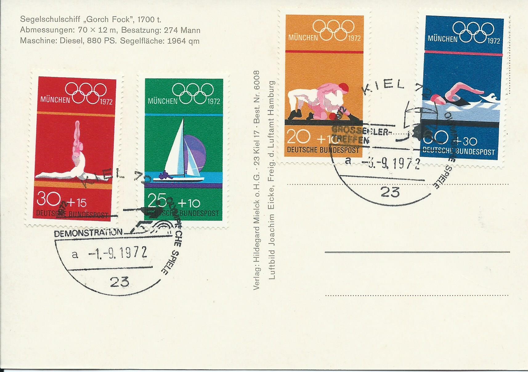 Als Ergänzung zu meinem Beitrag vom 15.8.16 noch einmal die Marken Mi.Nr. 719 bis 722 auf einer Stempelvorlage mit 2 verschiedenen Sonderstempeln zur Olympiade 1972: Stempelort Kiel einmal vom 1.9.72 mit dem Titel "Demonstration" und einmal vom 3.9.72 "Grossseglertreffen":