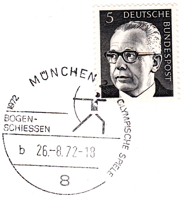 Brief per Einschreiben mit dem Sonder-R-Zettel "8 München 2, Olympische Spiele 1972, in München" und mit dem Sonderstempel "Bogenschiessen" vom 26.8.1972 mit dem Kennbuchstaben "a" mit vollständigem Datum ohne Uhrzeit.