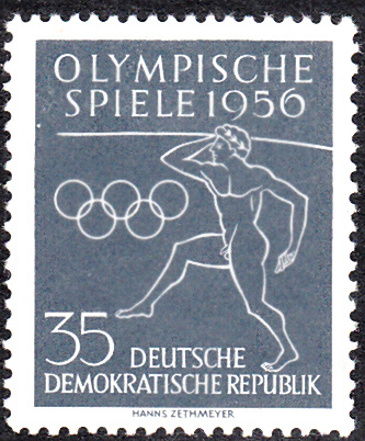 Die zweite Marke aus der DDR (MiNr 540) zeigt ebenfalls die Olympischen Ringe und einen Speerwerfer der Antike.