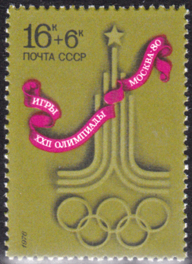 Aus der ersten Serie der UdSSR zu den Spielen in Moskau, die bereits 1976 erschien, stammt diese Marke (MiNr 4563). Sie steht symbolisch für die Übergabe der olympischen Fackel von Montreal an Moskau.