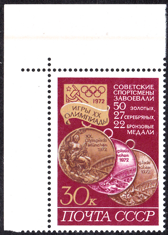 Auf der zweiten Marke dieser Ausgabe (MiNr 4060) werden je eine Gold-, Silber- und Bronze-Medaille der Spiele in München 1972 gezeigt und die Anzahl der von Sportlern aus der UdSSR errungenen Medaillen genannt.