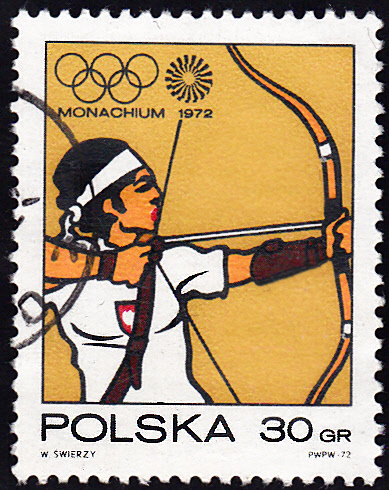 Aus der Serie Polens zu den Sommerspielen in München stammt diese Marke (MiNr 2150) mit einem Motiv zum Bogenschießen.