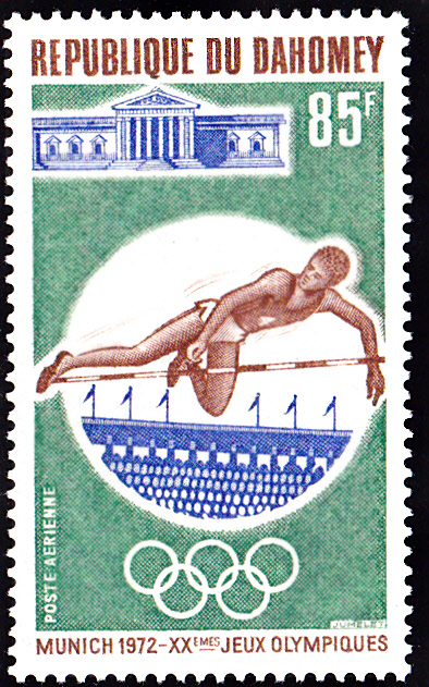 Auf der zweiten Marke aus Dahomey (MiNr 485) ist ein Athlet beim Hochsprung und die Glyptothek in München zu sehen.