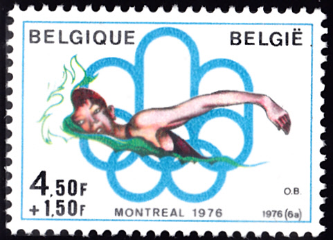 Auch in Belgien sind Marken zu den Olympischen Sommerspielen 1976 erschienen. Hier die Marke zu 4,50 fr + 1,50 Fr (MiNr 1852) mit der Abbildung einer Schwimmerin.