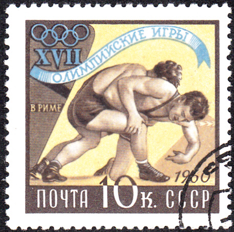 Auf einer Marke (MiNr 2370) aus der Serie der Sowjetunion zu den Olympischen Sommerspielen 1960 werden zwei Ringer beim Kampf gezeigt.