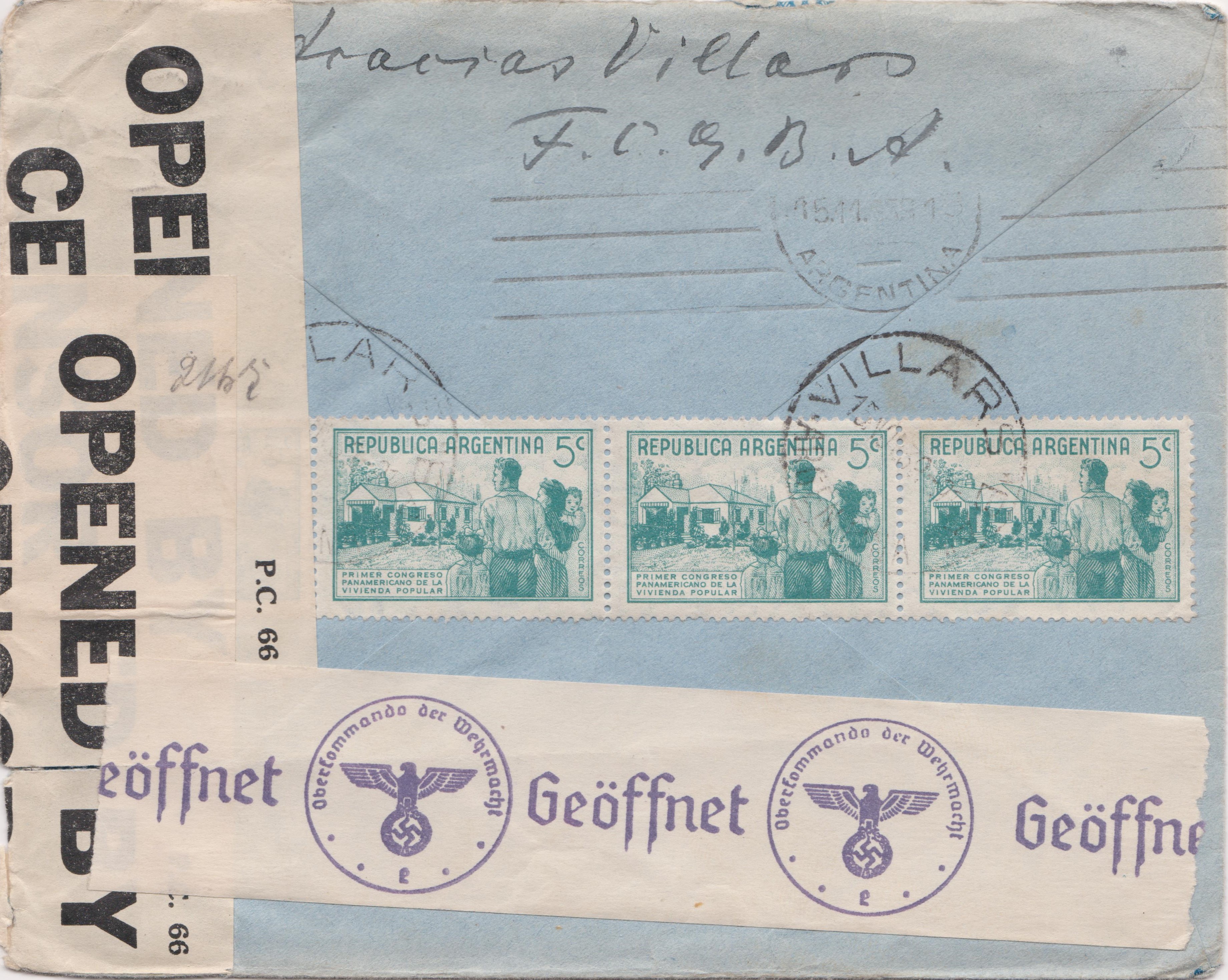 Somit lief dieser am 11.03.1941 in Argentinien aufgegebene Luftpostbrief durch die ABP Frankfurt, wo er rückseitig geöffnet und mit einem Verschlußstreifen "Geöffnet Oberkommando der Wehrmacht -e-", laut Landsmann EV3.2, wieder verschlossen wurde: