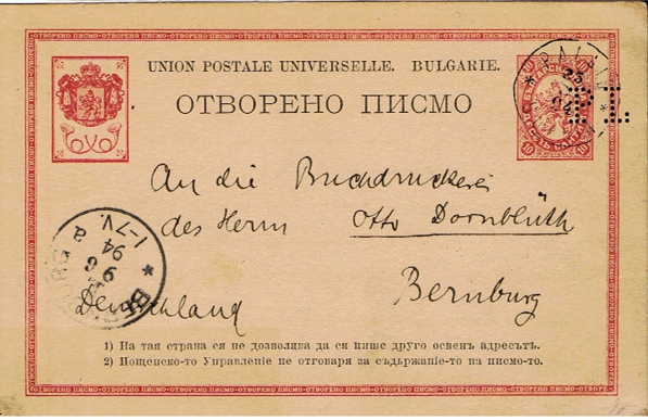 Die hier gezeigte Karte ist eine Ganzsache Michel P 1 / Bulphila PC 1.( Währung: Centimes) mit waagerechter Lochung PL, gestempelt Palais Sofia 25.V. (18)94.