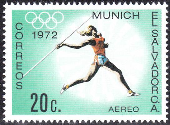 Es folgt eine Marke zu den Olympischen Spielen 1972 in München aus El Salvador (MiNr 1076) mit einer Speerwerferin.