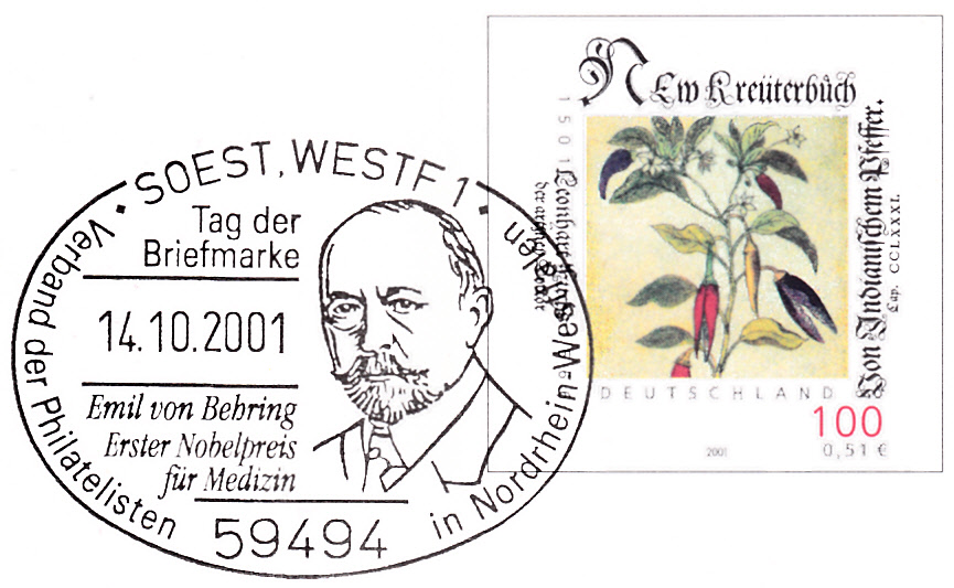 Pluskarte (MiNr PSo 77 II) mit einem Zudruck zum Tag der Briefmarke 2001 des Verbandes der Philatelisten in Nordrhein-Westfalen e.V. und dem dazu passenden Sonderstempel vom 14.10.2001 aus Soest. Im Zudruck und im Sonderstempel wird der Nobelpreisträger Emil von Behring gezeigt.
