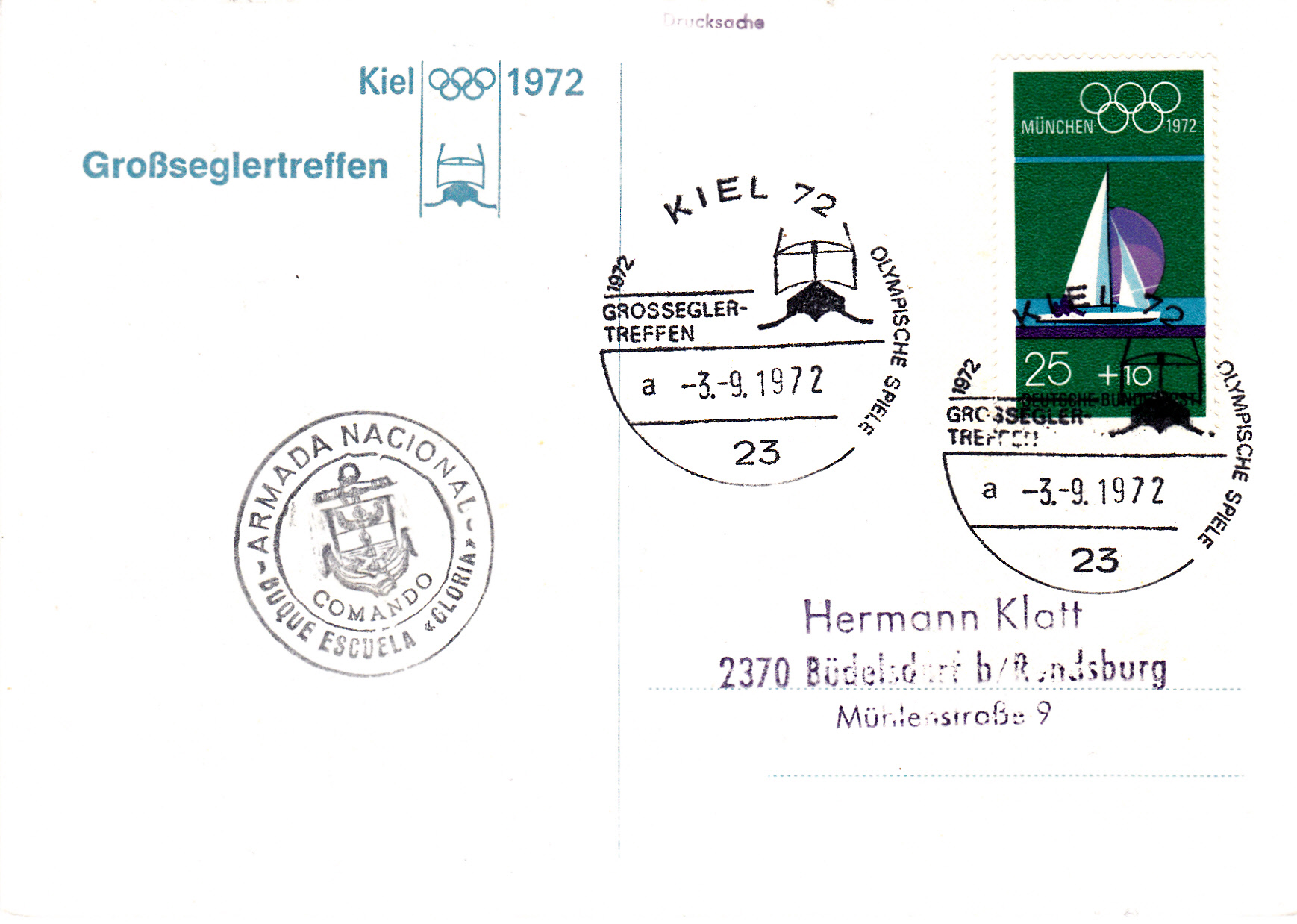 Diese Postkarte als Drucksache mit Sonderstempel "Großseglertreffen" vom 3.9.1972 und einem Cachetstempel der "Eagle" dokumentiert deren Teilnahme in Kiel 1972.
