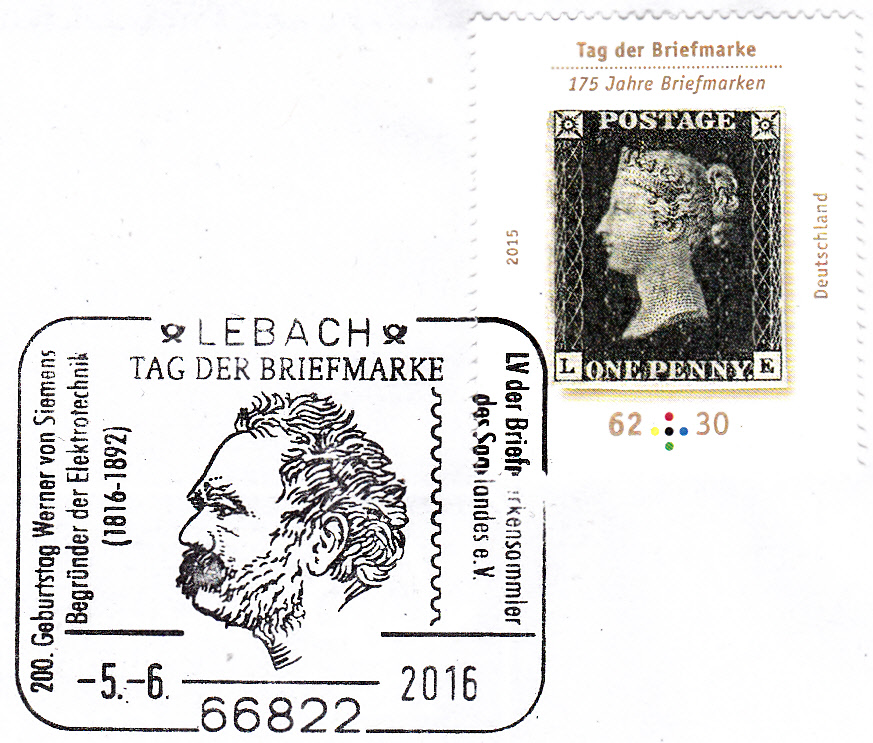 Bereits am 5.6.2016 gab es in Lebach den ersten Sonderstempel zum Tag der Briefmarke 2016. Im Stempel wird Werner von Siemens gezeigt und an seinen Geburtstag vor 200 Jahren erinnert.