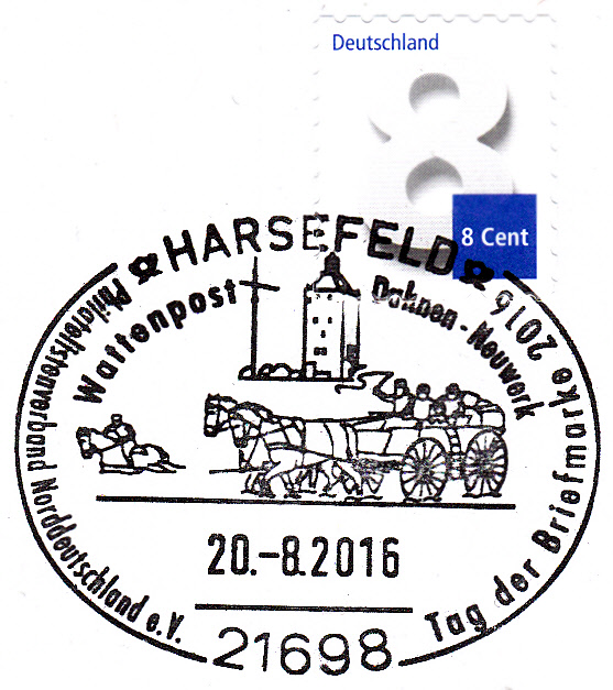 Sonderstempel aus Harsefeld vom 20.8.2016 zum Tag der Briefmarke 2016. Im Stempel sind der Leuchtturm Neuwerk und ein Gespann der Wattenpost Duhnen-Neuwerk zu sehen.