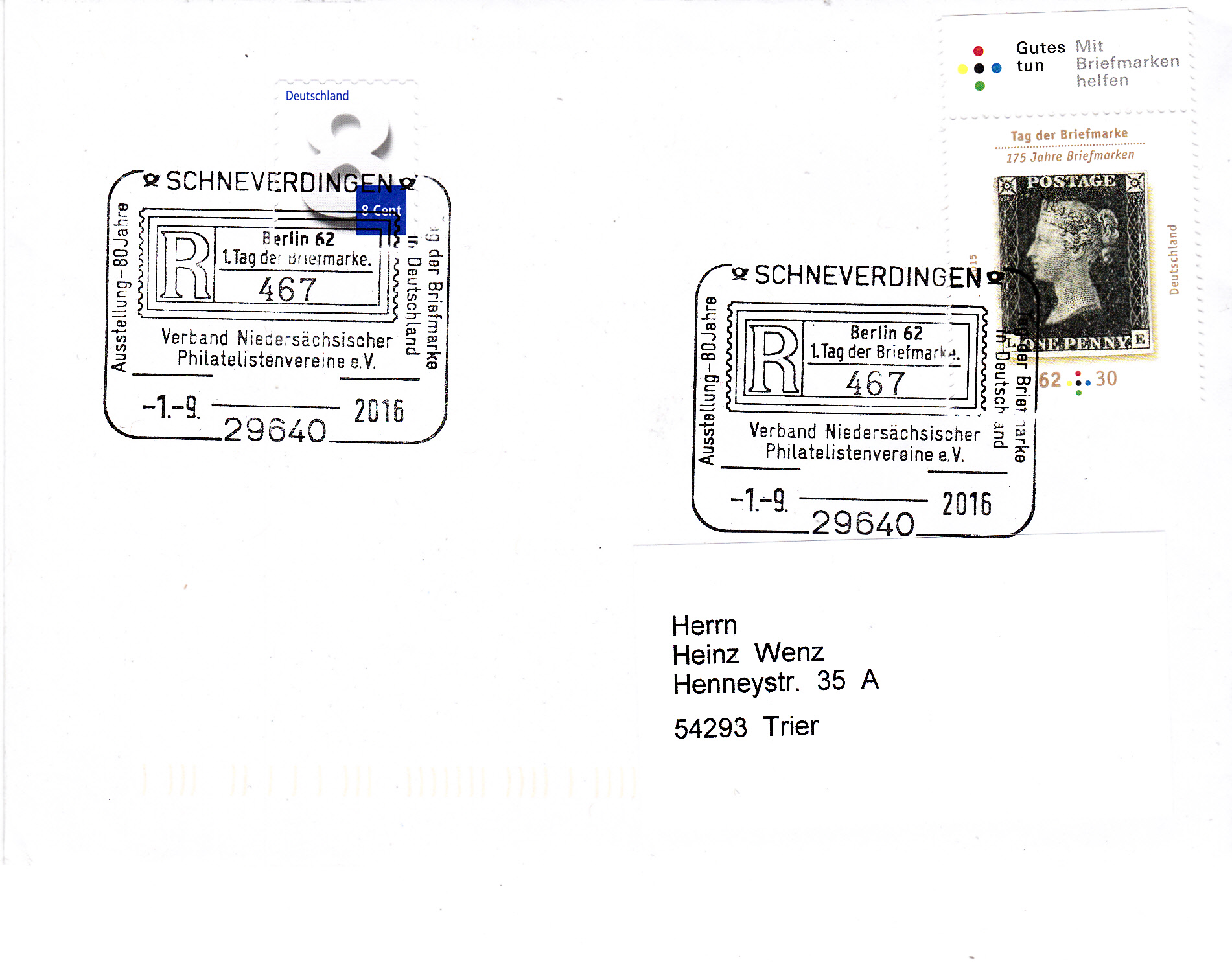 Sonderstempel aus Schneverdingen vom 1.9.2016 zum Tag der Briefmarke 2016. Im Stempel wird auf das Jubiläum "80 Jahre Tag der Briefmarke" hingewiesen und ein stilisierter Einschreibezettel "Berlin 62, 1.Tag der Briefmarke, 467" abgebildet.