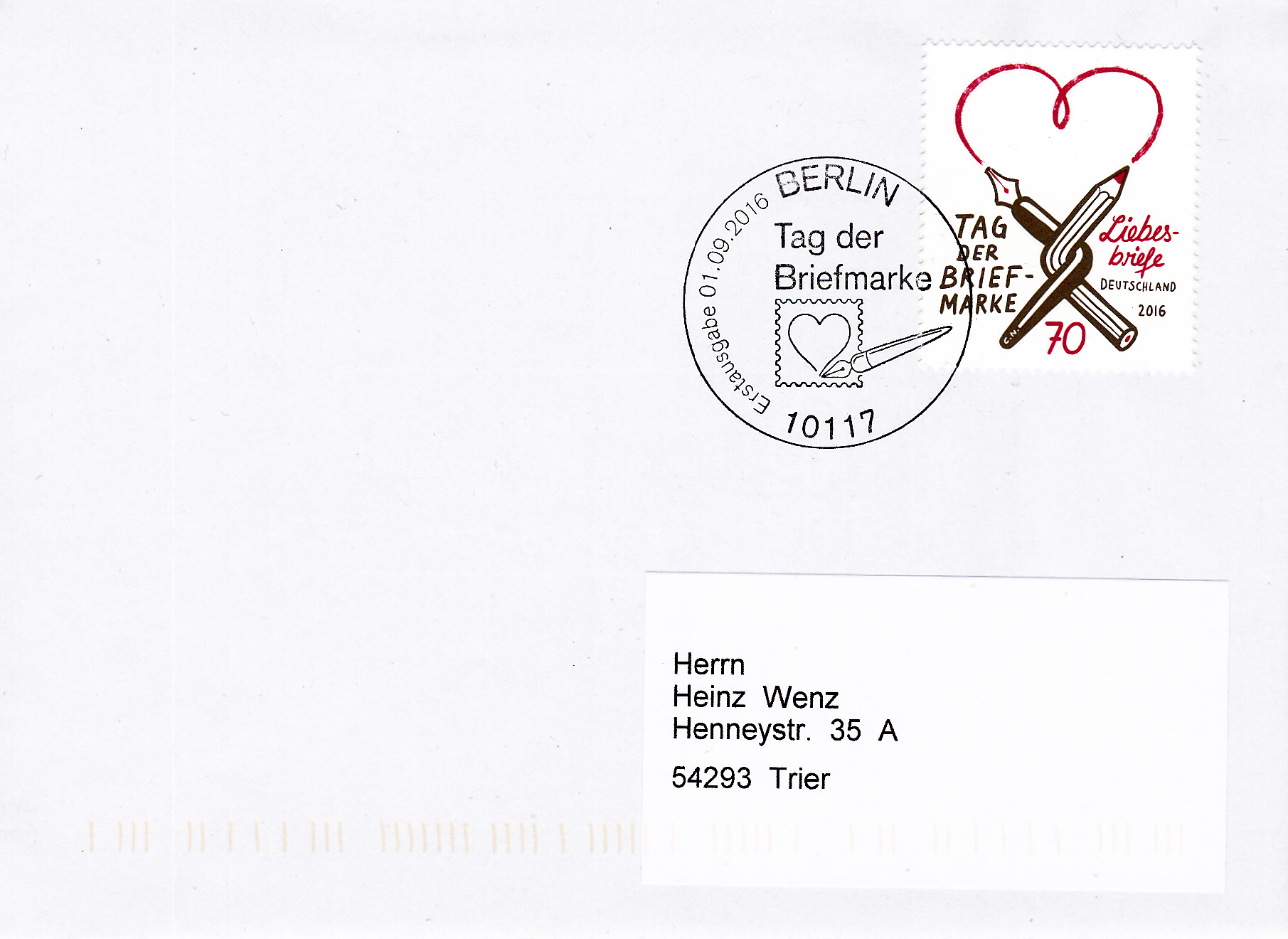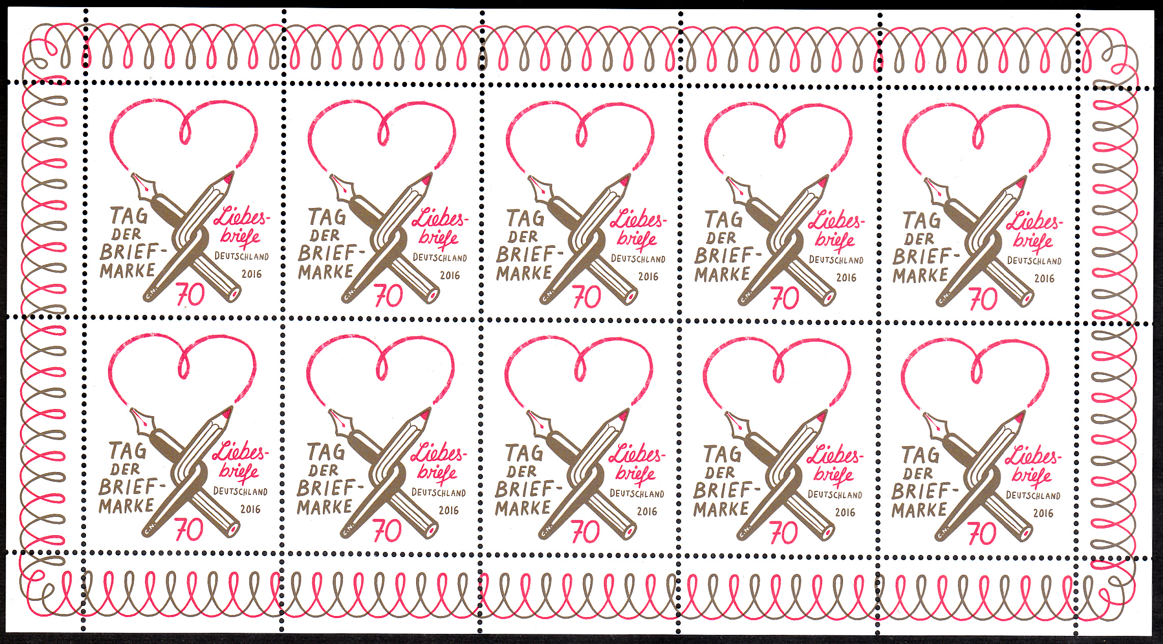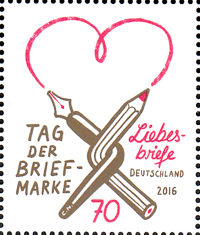 Zum Tag der Briefmarke 2016 erschien bei der Deutschern Post AG am 1.9.2016 eine Marke (MiNr 3259) zum Thema "Liebesbriefe" mit dem Bild "Verschlungener Füllfederhalter mit Buntstift" und einem gezeichneten Herz.