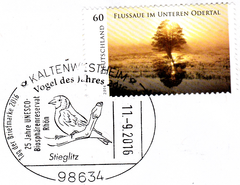 Sonderstempel zum Tag der Briefmarke vom 11.9.2016 aus Kaltenwestheim mit einem Stieglitz, dem Vogel des Jahres 2016, im Stempelbild.
