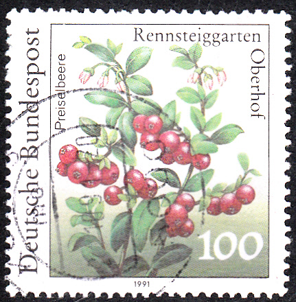 Auf dieser Marke aus der Serie "Pflanzen aus dem Rennsteiggarten in Oberhof" (MiNr 1508) sind Preiselbeeren an einem Strauch abgebildet.