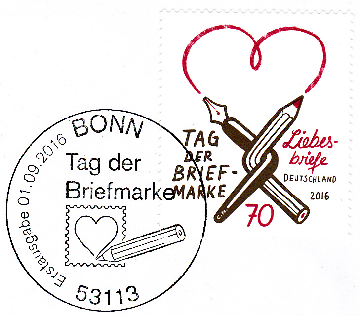 Zum Tag der Briefmarke 2016 erschien bei der Deutschern Post AG am 1.9.2016 eine Marke (MiNr 3259) zum Thema "Liebesbriefe" mit dem Bild "Verschlungener Füllfederhalter mit Buntstift" und einem gezeichneten Herz.