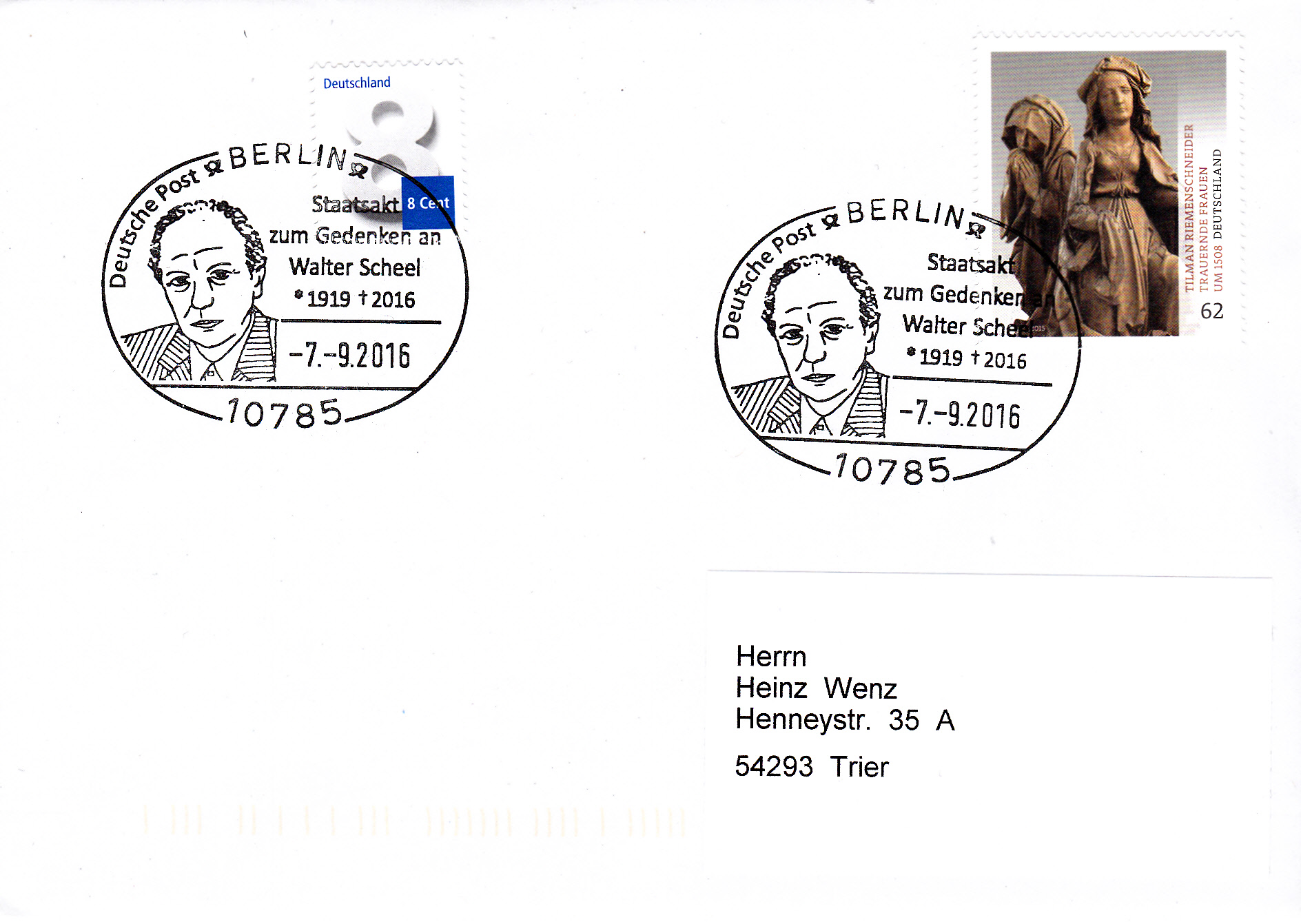Sonderstempel aus Berlin vom 7.9.2016 zum Staatsakt zum Gedenken an Walter Scheel mit seinem Porträt.