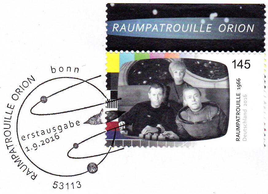 Bei der Deutschen Post AG gab es am 1.9.2016 zum Jubiläum 50 Jahre „Raumpatrouille Orion" diese Sondermarke (MiNr 3260). Im Markenbild wird eine Originalszene mit Dietmar Schönherr, Eva Pflug und Wolfgang Völz (Cliff McLane, Tamara Jagellovsk und Mario de Monti bei Rettungsflug im Lancet zum Raumkreuzer Hydra) gezeigt.