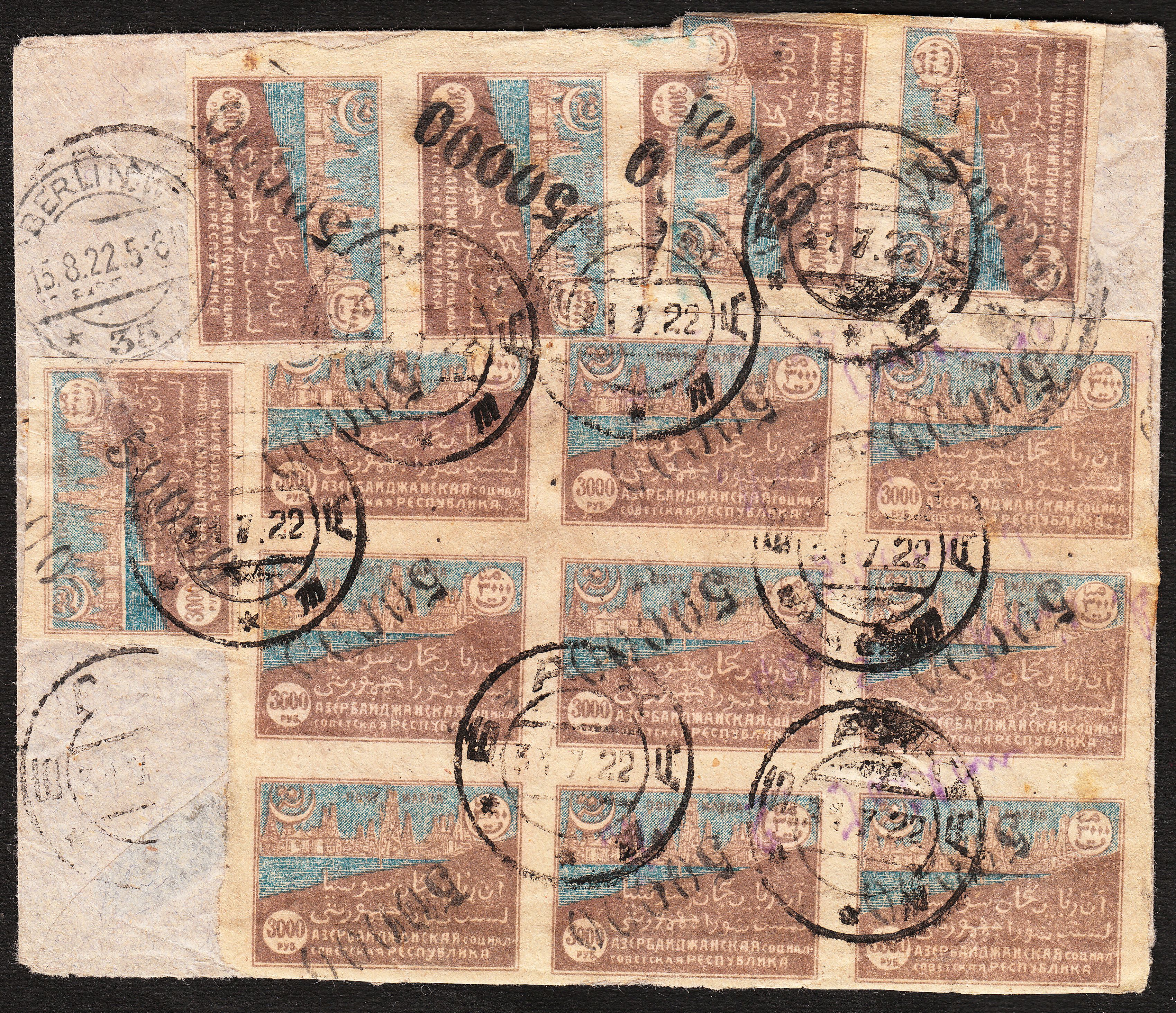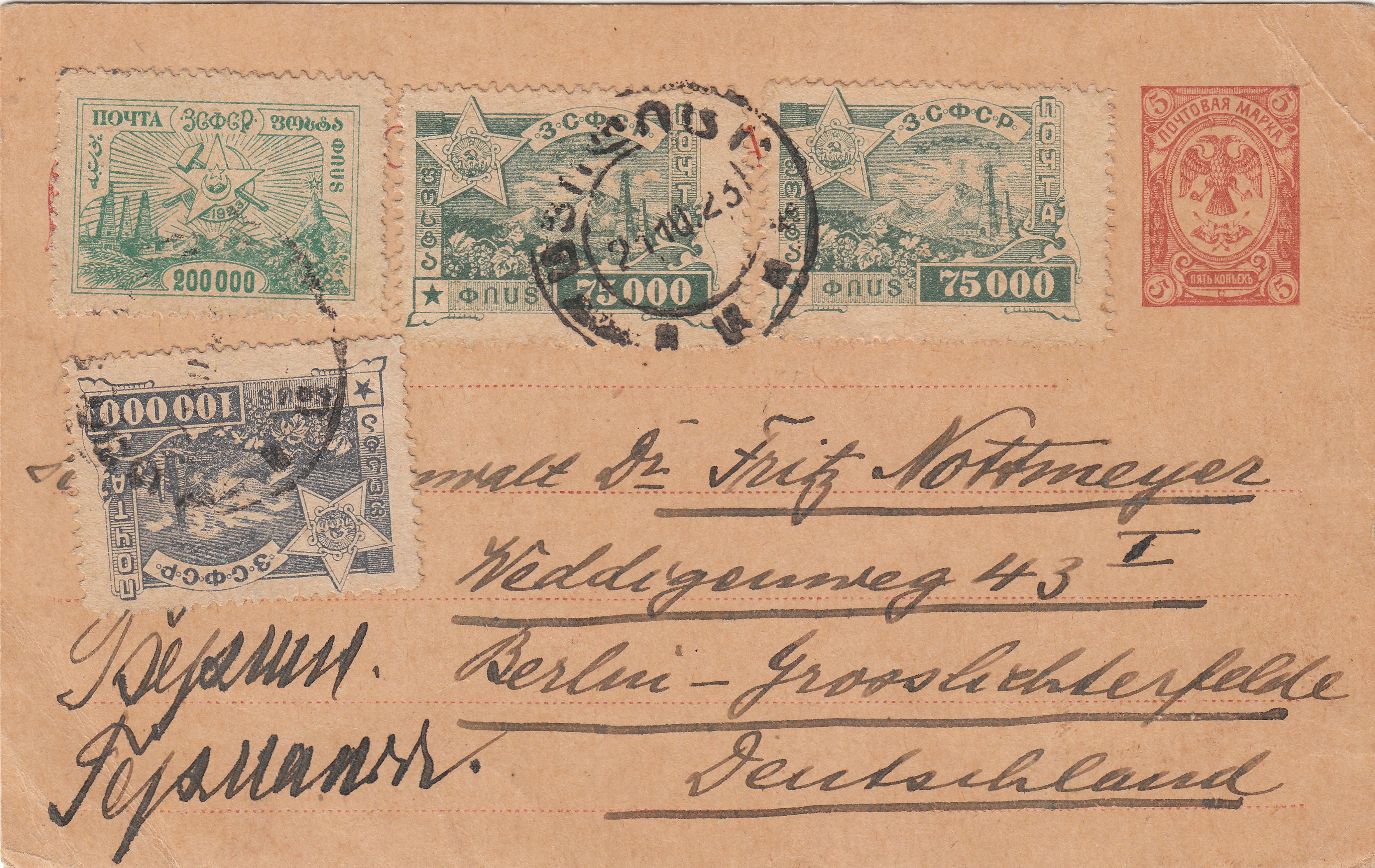 Dieser nach Berlin adressierte Beleg wurde am 21.10.1923 in Tiflis als der Hauptstadt der "Transkaukasischen Sozialistischen Föderativen Sowjetrepublik" aufgegeben: