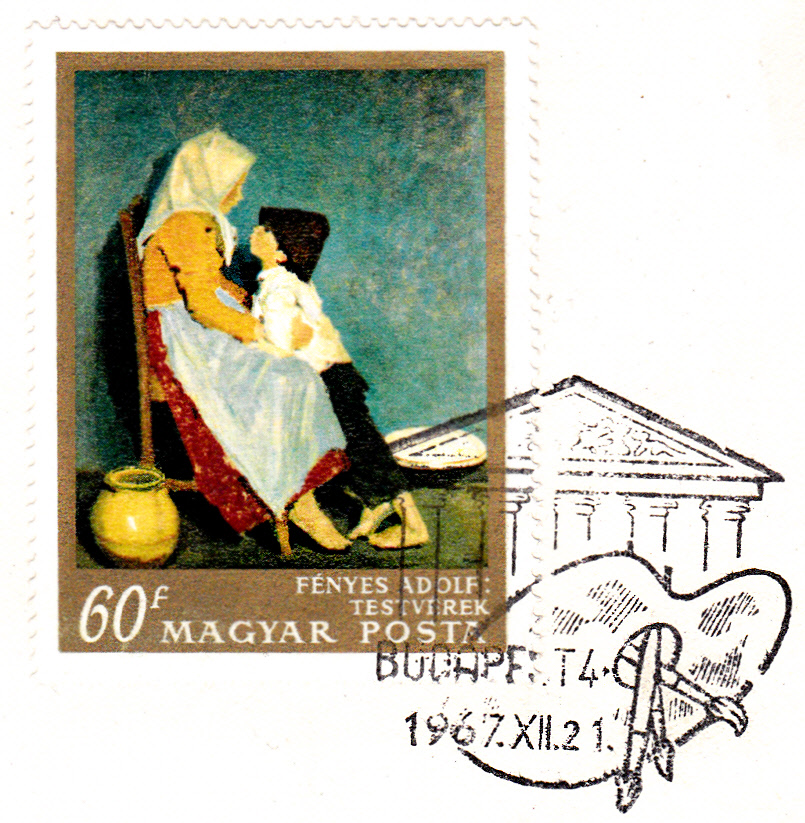 In der Serie "Gemälde der Nationalgalerie Budapest Meister des 20. Jahrhunderts" erschien auch diese Marke (MiNr 2370 A)mit seinem Werk "Geschwister", hier auf einem per Einschreiben gelaufenem Erstagsbrief. Rückseitig wurden weitere Marken verklebt.