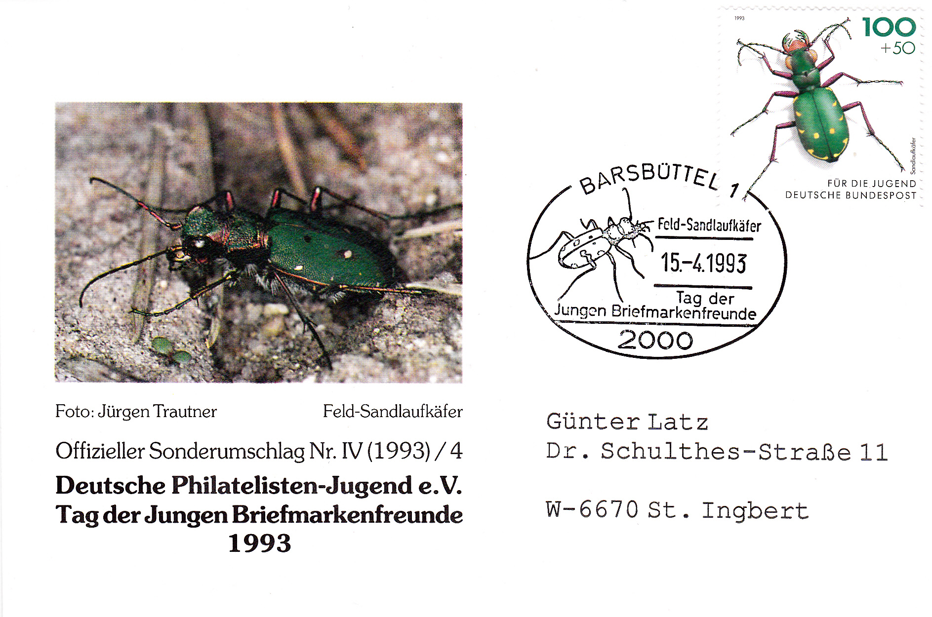 Die Jugendmarke mit dem Feld-Sandlaufkäfer wurde hier auf einem Brief am 15.4.1993, dem Ausgabetag der Marke, mit einem Sonderstempel aus Herford zum Tag der Jungen Briefmarkenfreunde gestempelt. Das Stempelbild zeigt einen Wald-Sandlaufkäfer, erkennbar auf der etwas anderen Zeichnung auf den Flügeldecken.