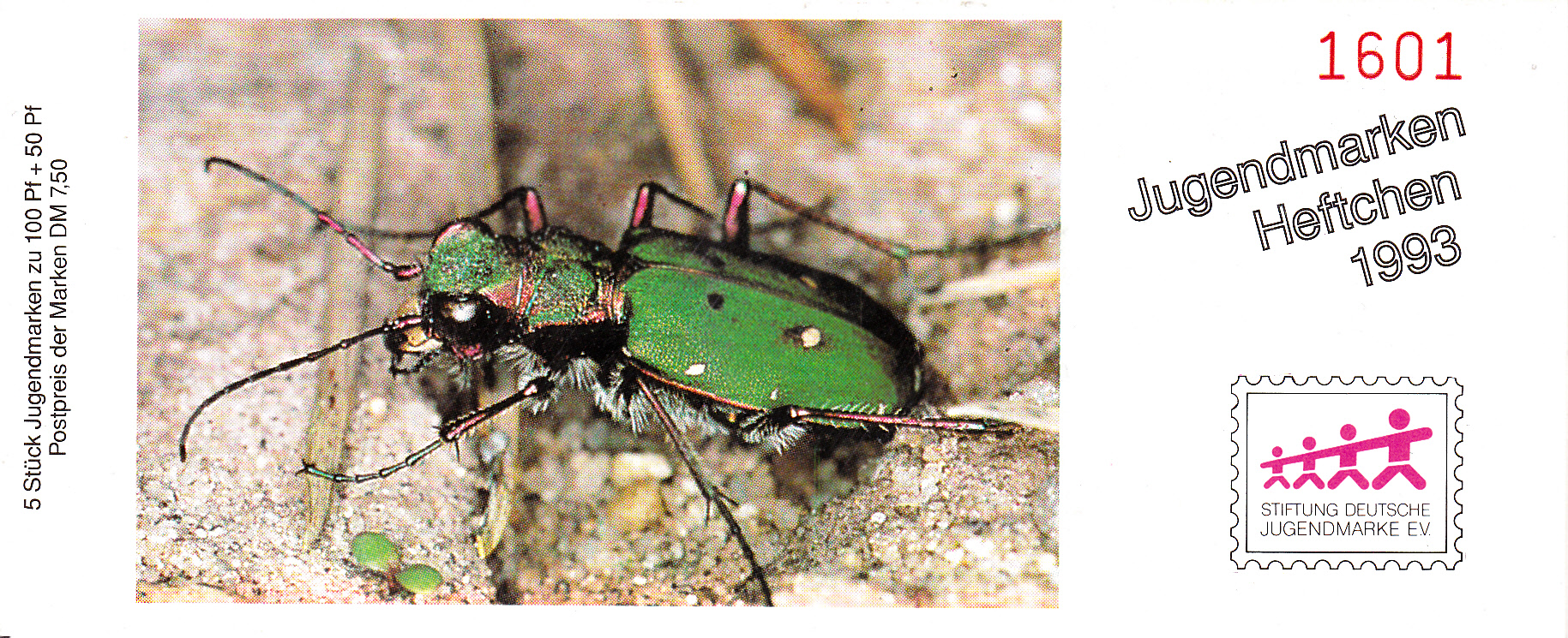 Die Jugendmarke mit dem Feld-Sandlaufkäfer wurde hier auf einem Brief am 15.4.1993, dem Ausgabetag der Marke, mit einem Sonderstempel aus Barsbüttel zum Tag der Jungen Briefmarkenfreunde gestempelt. Das Stempelbild zeigt ebenfalls einen Feld-Sandlaufkäfer.